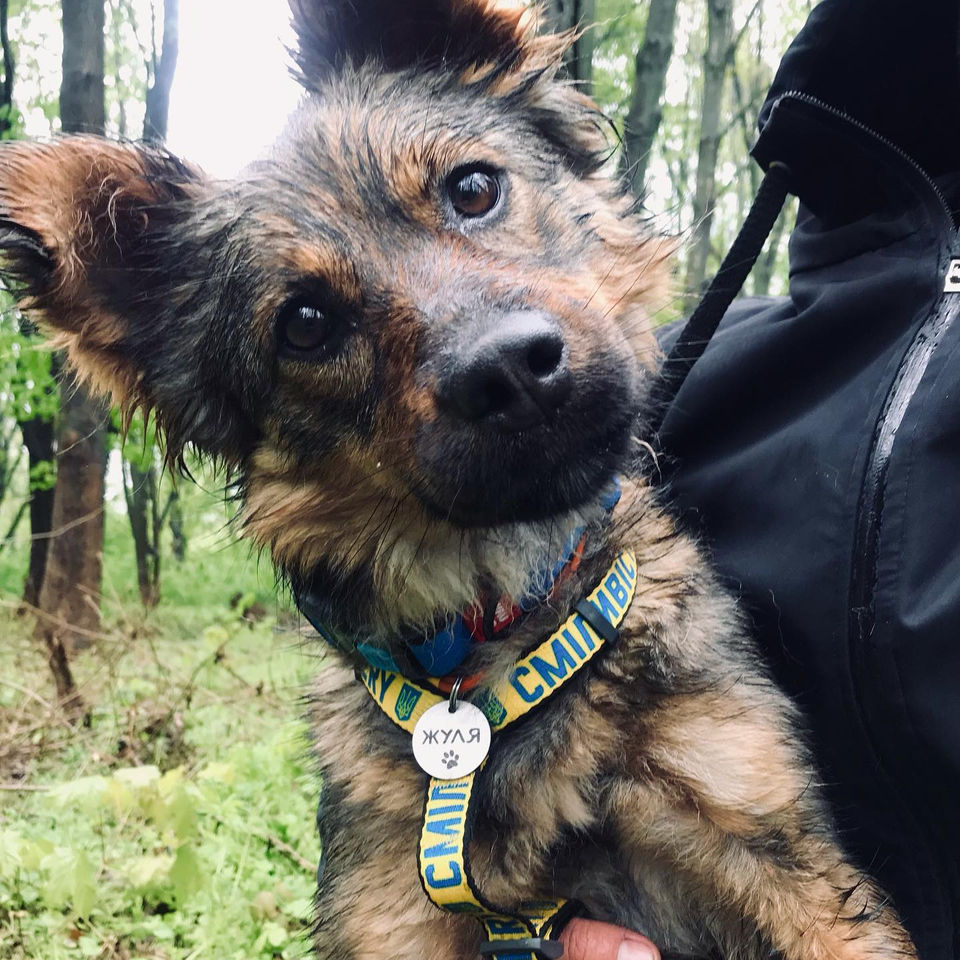 Жуля мала контузію, бо у її дворі розірвався снаряд… У нас Жуля пройшла лікування, стерилізацію, чіпування і вакцинацію, невеличку соціалізацію, і тепер зі своїми новими людьми вона заново вчиться довіряти цьому світу.